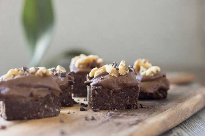 - Take the brownies from the freezer and cut into squares (around 12). Spread generous amounts of icing onto your brownies and top it off with some extra walnuts and/or nibs.